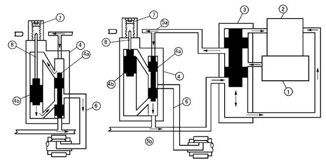 1、潤(rùn)滑泵;2、貯油器;3、換向閥;4、分配器;4a、先導(dǎo)活塞;4b、主活塞